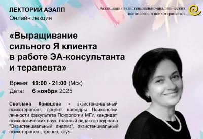 ЛЕКТОРИЙ АЭАПП. "ВЫРАЩИВАНИЕ СИЛЬНОГО «Я» КЛИЕНТА В РАБОТЕ ЭА-КОНСУЛЬТАНТА И ТЕРАПЕВТА"