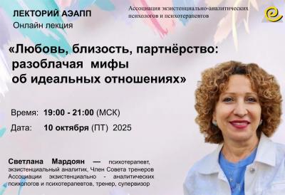 ЛЕКТОРИЙ АЭАПП. "Любовь, близость, партнёрство: разоблачая мифы об идеальных отношениях" на лекции Светланы Мардоян